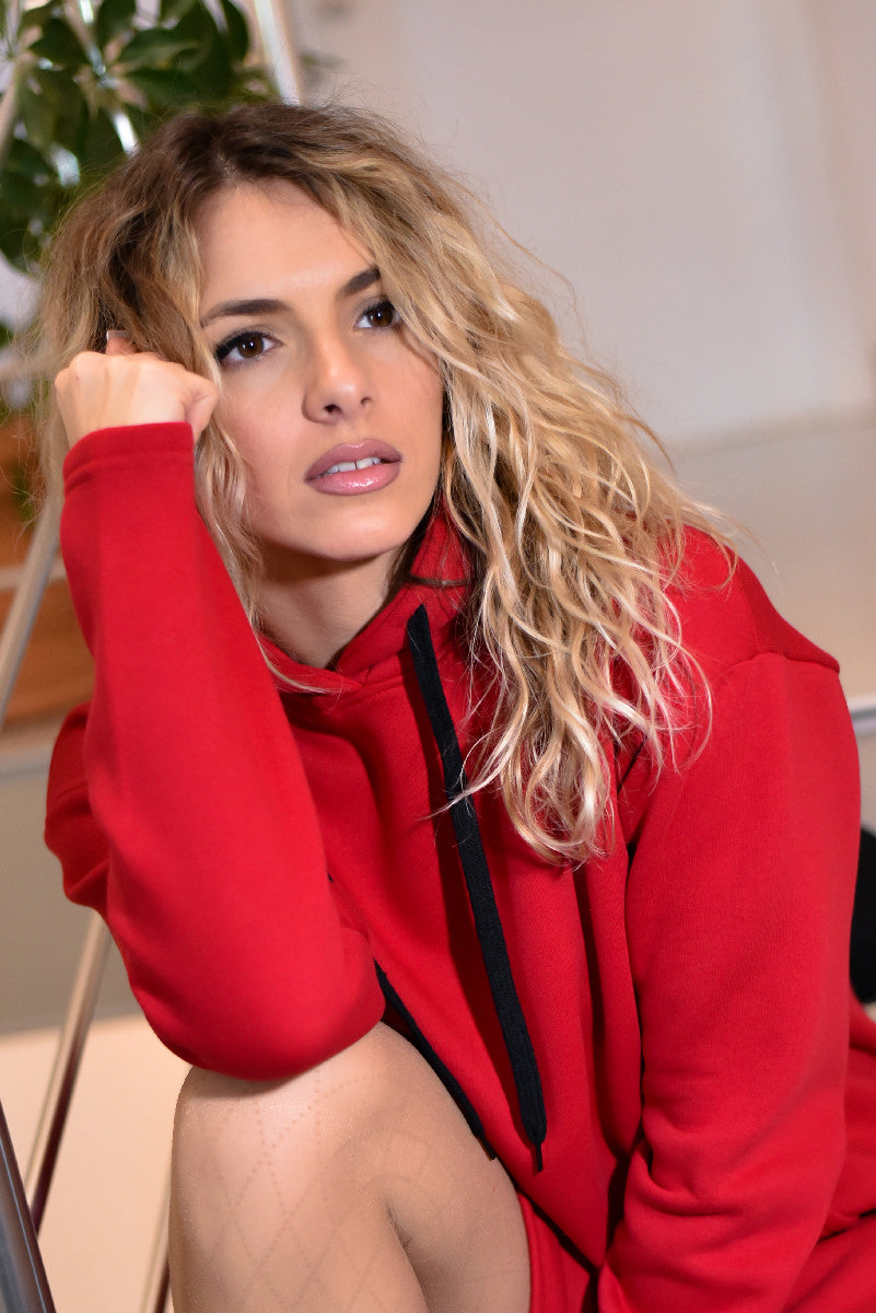 Kangaroo pocket with hood, red dress, 2022, Cotton hoodie, oversize.